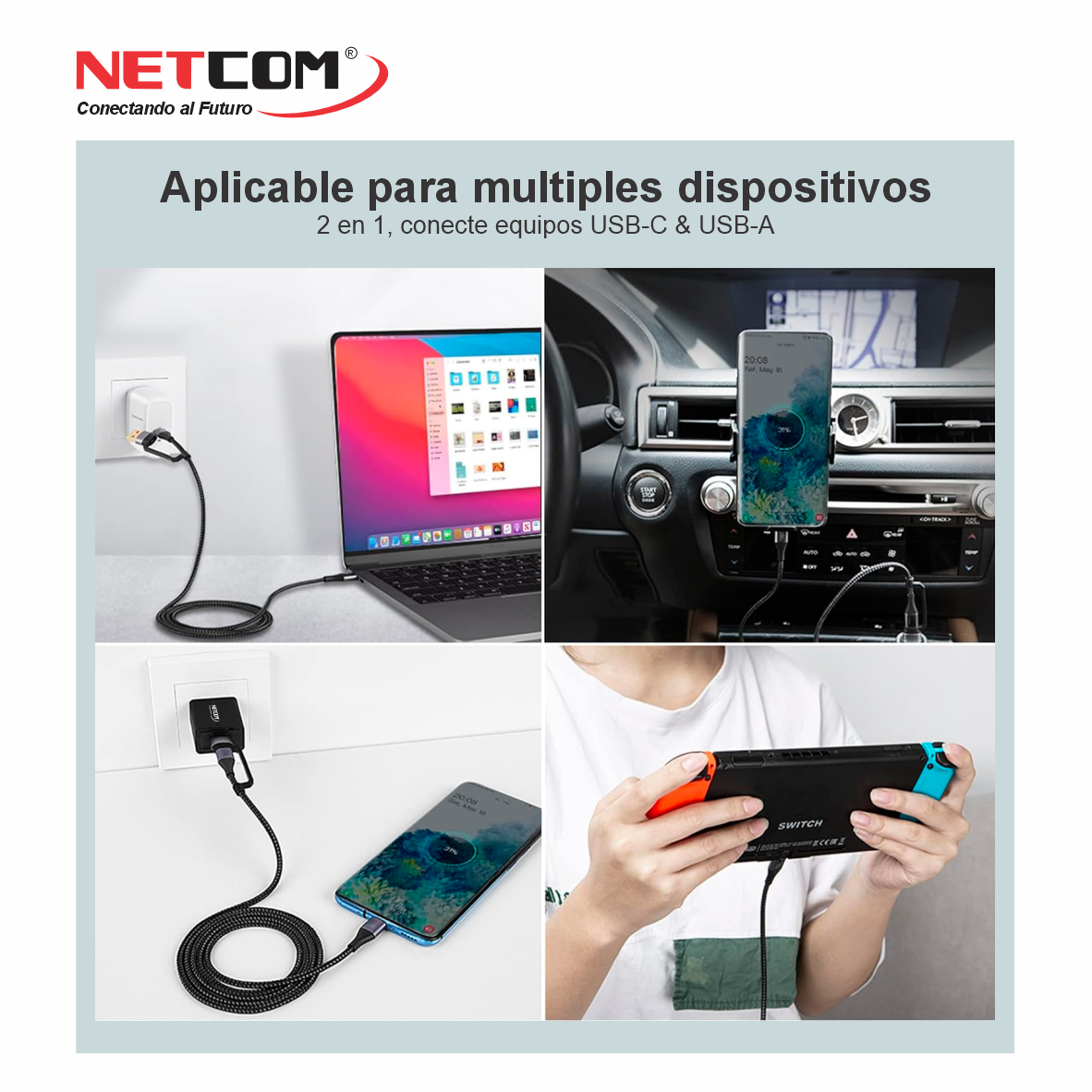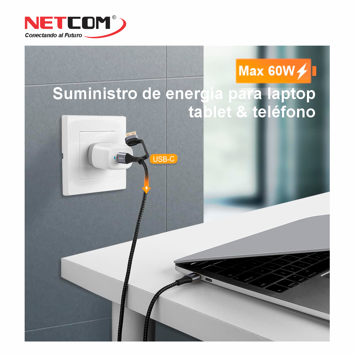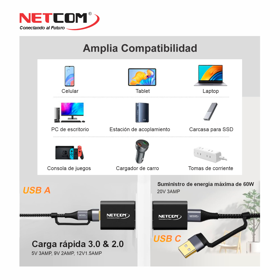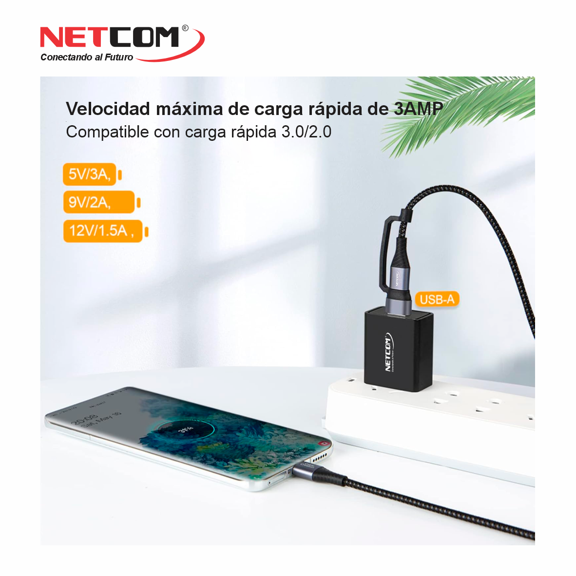 Soporte para carga rápida QC de 3 AMP en USB-A (5V3AMP, 9V2AMP, 12V1.5A), modo de carga PD de 60W en USB-C (20V3AMP) y transferencia de datos súper speed 5Gbps, el cable de carga rápida NETCOM tipo C se conecta al adaptador de carga rápida QC/PD para cargar el dispositivo con una salida máxima de 60W, y puede transferir archivos/videos/imágenes/audio. Carga hasta un 80% en 30-40 minutos y transfiere datos de hasta 5Gbps. El cable cargador USB C puede transferir documentos de trabajo y estudio, viajes de negocios en carplay y audio de entretenimiento.