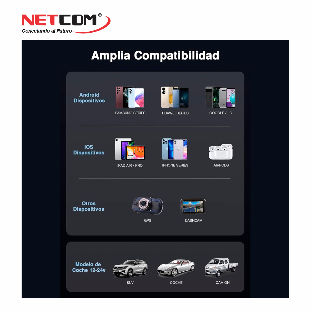 - Carga inteligente, este cargador de coche ajusta automáticamente la velocidad de carga a tus dispositivos y carga todos los dispositivos compatibles con USB como tu smartphone, tablet, a la velocidad óptima. Funciona con todos los coches de 12 ~ 24 V.